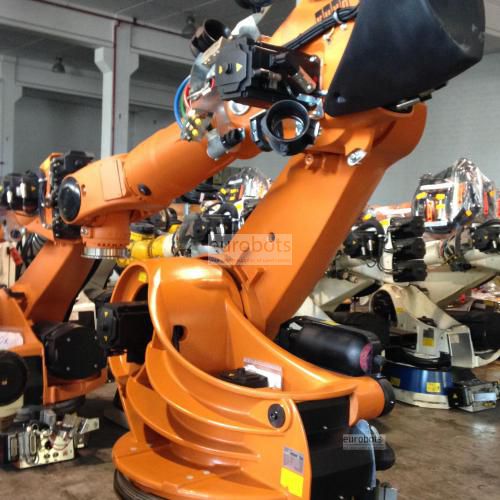 Robot Industrial de 6 ejes carga pesada útil , Kuka KR360 sobre una unidad lineal servocontrolada (pista). centros nominales que van 2000-12000 mm. El KR 360 es un robot industrial de seis ejes para la instalación en el suelo o en el techo. Equipado con el potente control KR C2 bajo plataforma WinXP, versión de software 5.2.14 . El control del robot KR C2 facilita la programación con su interfaz de Microsoft Windows. Es ampliable, se puede integrar en las redes a través de un bus y contiene paquetes de software ya hechos.